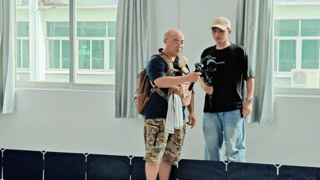 在拍摄当天,是这段时间里难得的好天气,而摄影师有条不紊的做这准备工作。云台、摄像机的调试、场景的考量、学生的表现,经过良好的沟通后,拍摄正式开始。但